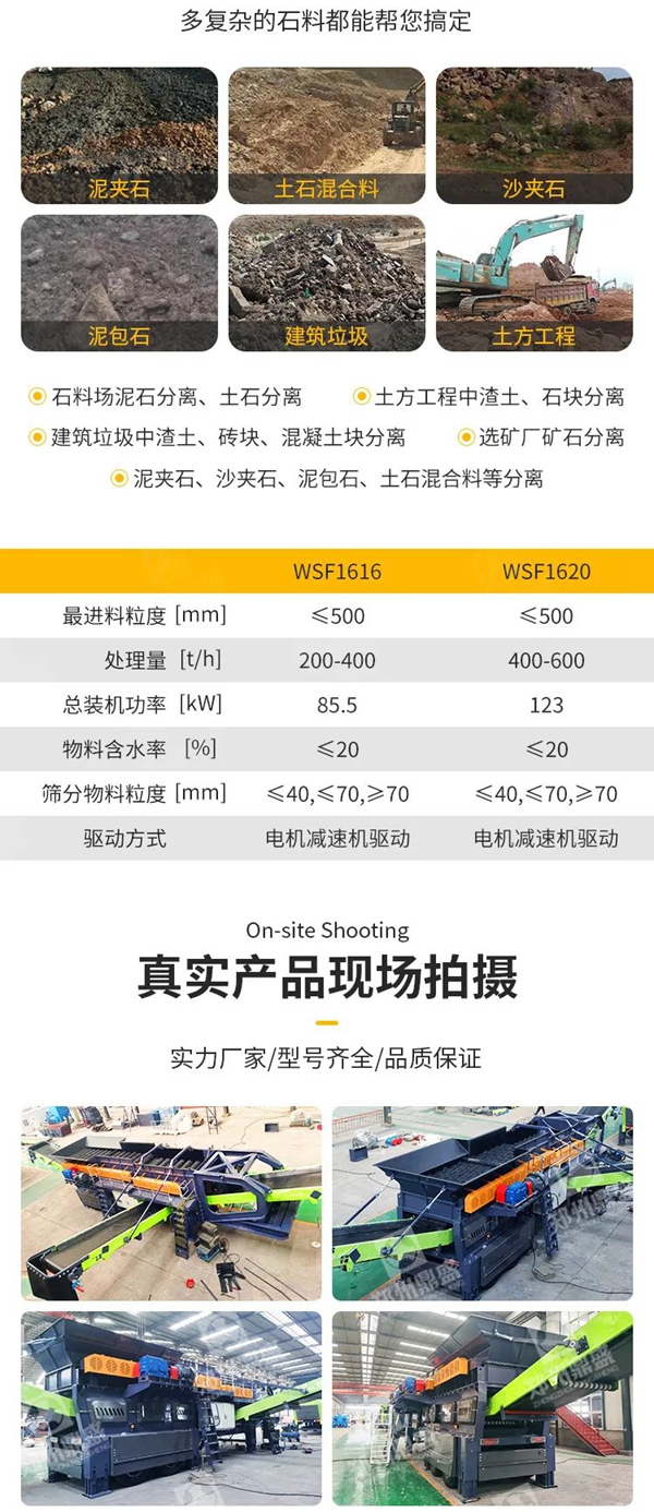 如果選用傳統的振動篩和螺旋洗礦機作為泥石分離機可以嗎?有些可以,有些根本無法做到。振動篩可以篩分粒度相差不大的泥土和碎石,對于大塊石頭和泥土分離難以做到,而且對于粘性高的泥土石頭分離幾乎不可能做到;螺旋洗礦機可以分離一定粘性的泥土和石頭,但是需要大量的水,對于許多缺水的礦山來說,又是一個非常頭疼的問題,甚至無水的時候,項目必須擱淺,無法開發。