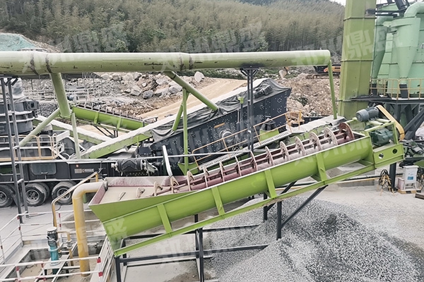 鄭州鼎盛在湖南建設的時產150噸花崗巖制砂生產線包括了給料、破碎、制砂、洗砂等模塊,其中洗砂模塊采用的XL螺旋式洗砂機。