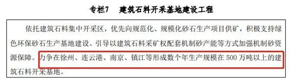 《規(guī)劃》強(qiáng)調(diào)長(zhǎng)江經(jīng)濟(jì)帶、長(zhǎng)三角區(qū)域一體化發(fā)展等國(guó)家發(fā)展戰(zhàn)略實(shí)施,新型工業(yè)化、新型城鎮(zhèn)化的推動(dòng)以及大量基礎(chǔ)設(shè)施建設(shè),對(duì)礦產(chǎn)資源的需求仍將維持在高 位。砂石資源供需矛盾突出,要統(tǒng)籌實(shí)施國(guó)家戰(zhàn)略性礦產(chǎn)和江蘇重要礦產(chǎn)的勘查開(kāi)發(fā),保持一定規(guī)模的礦產(chǎn)開(kāi)采總量,提高礦產(chǎn)資源保障能力,規(guī)模化開(kāi)采建筑石料,滿(mǎn)足經(jīng)濟(jì)社會(huì)發(fā)展需求。